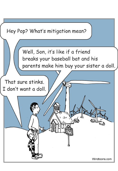 Think the windtoon message sounds silly? How about if the same government agency that told you 18 historic sites would be negatively impacted by the installation of an industrial wind complex decided that a check for $10,000 would solve the problems. No physical modification required, no corrective action, no effort required to remove the negative impact, just send a check.