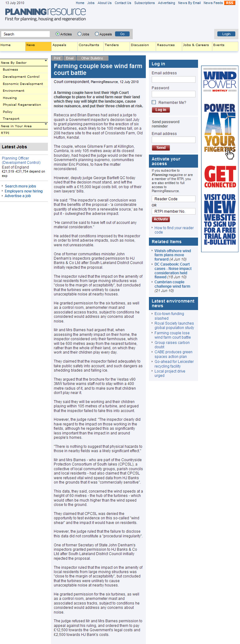 According to the article written by the Court correspondent for the UK based Planning Resource journal, the project was initially denied by the South Lakeland District Council, but then permitted by an inspector for former communities minister John Denham. The couple, Rebecca and Brian Barnes, had asked a judge to quash a Government inspector’s decision because the turbines would be set only 105 meters away at its closest boundary. The inspector measured to their house, which is some 600 meters from the nearest turbine. The judge dismissed the potential for ice throw, collapse of the 100 meter plus turbines or failure which would toss blades and other debris well onto the farmer’s property. When the fact that the family’s children played and farm hands worked in the newly created “danger zone”, the judge was unwavering and stated, “”The inspector clearly did have regard to the impact on those working in the fields, although he regarded this as significantly less important than the impact in and around people’s homes. There is nothing to suggest that physical hazards to those in nearby fields was a likely significant effect.” Clearly regarded the impact but significantly less important? Does this judge really value the safety of these folks so little as to write the hazards off as not a “likely significant effect?”