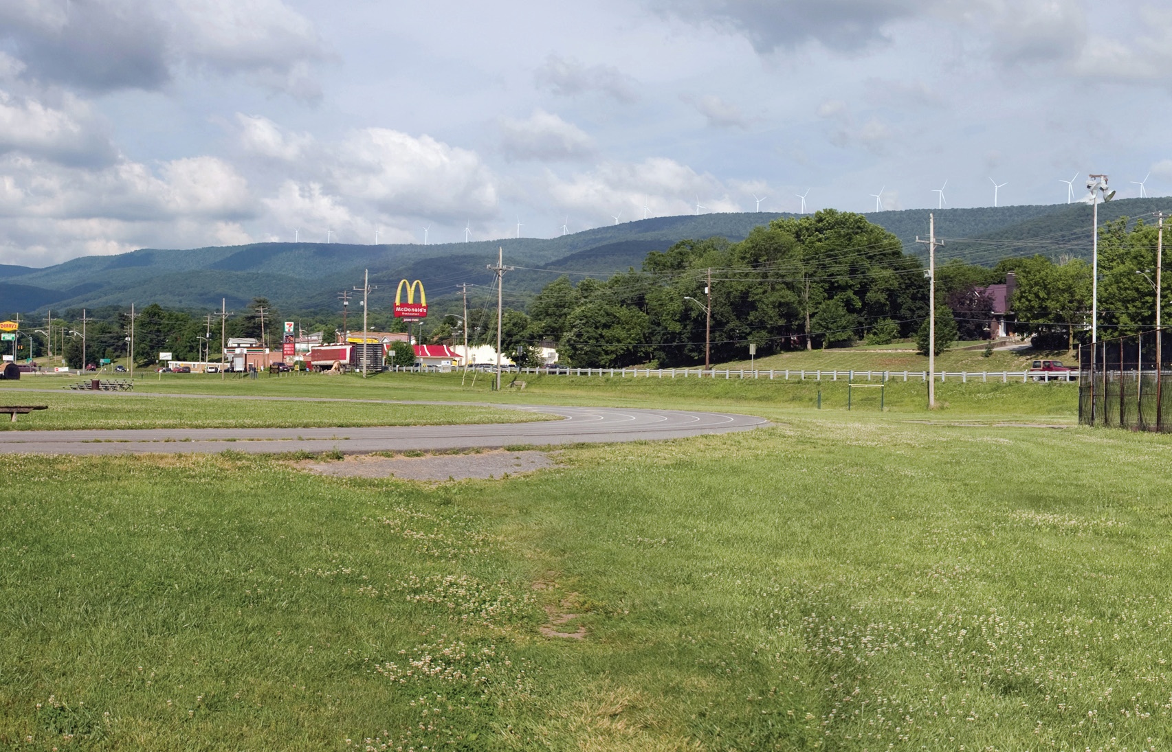 Now, for any of you folks from the local area wondering how it is that the size of the “simulated” Pinnacle turbines from 2.5 miles away appear to be similar in size to those in actual view from the Mt. Storm project when seen some 12 miles away from Keyser … well, we wonder the same thing.  Remember that these turbines will be some 450 ft. tall.  We have a feeling that the simulated photos just don’t do justice to the proportion of items in the distance.  Case in point, the real McDonald’s sign looks a lot larger than the photo arches when you’re actually at the sports complex.  Plus, the Pinnacle tower, which is visible from this location even though it is much smaller than the turbines, cannot be seen.