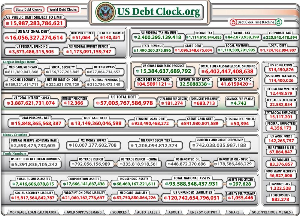 At 7:31 this morning, according to the US National Debt Clock, the US Taxpayers are on the hook for an incredible $16,056,327,274,614.00. See for yourself: